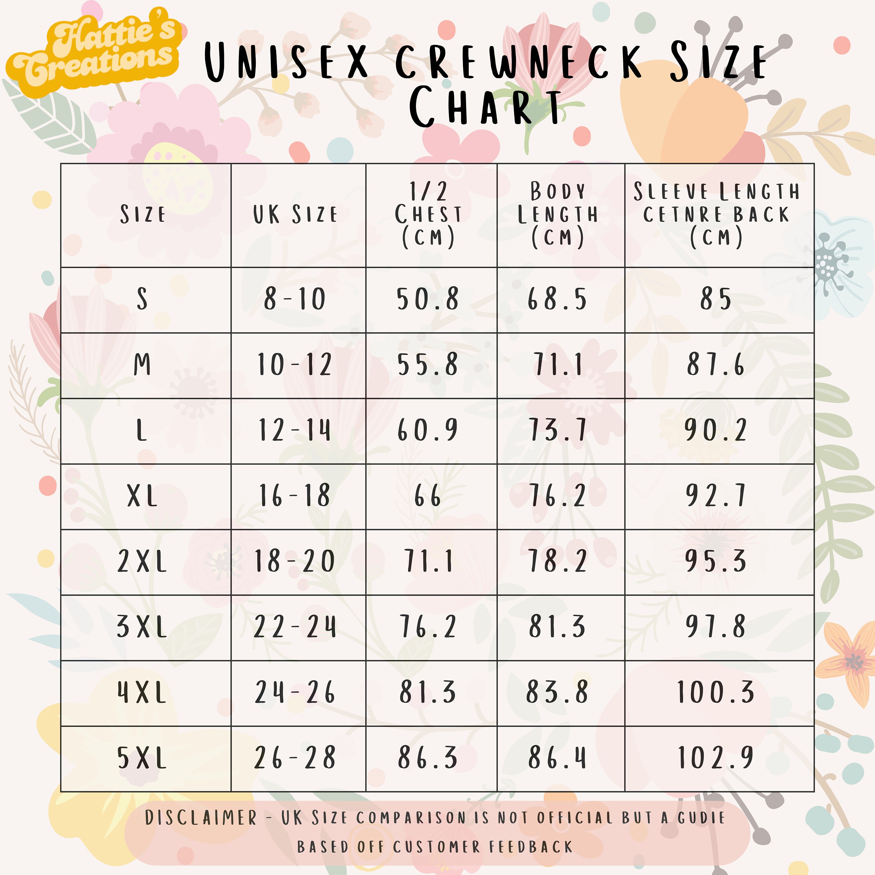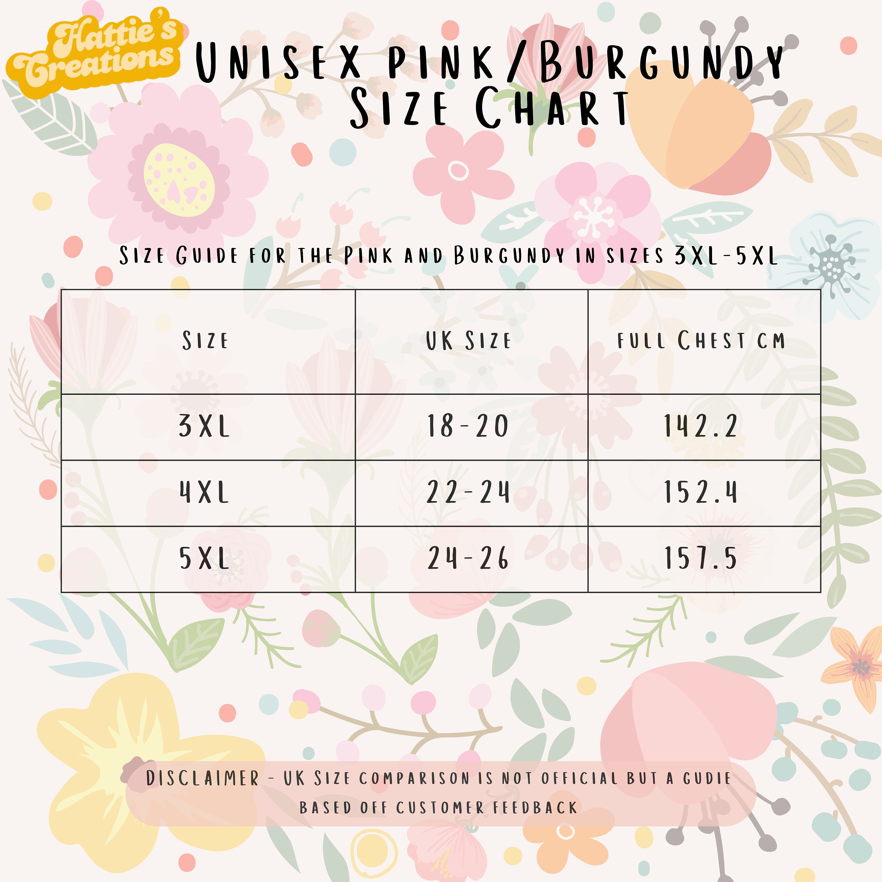 *Pink and Burgundy have different measurements, see separate size chart